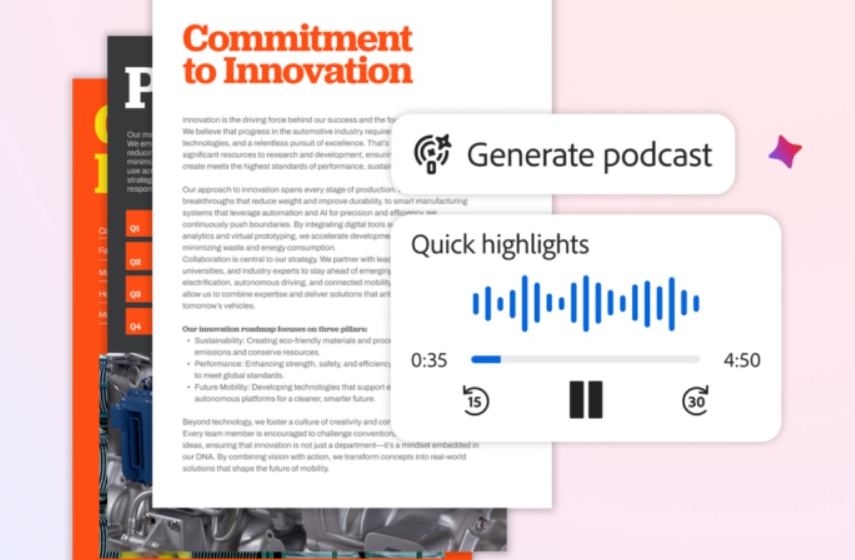 Otra alternativa que ofrece Adobe es la de preparar reuniones con podcasts personalizados. Aquí entra la función Generar podcast de Acrobat.Bastará con llevar conjuntos de notas, transcripciones e informes a un espacio PDF y solicitarle al asistente que resuma toda esa información al puro estilo podcast.