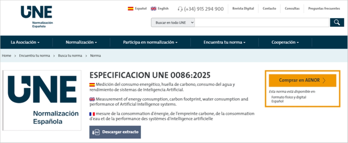 La Asociación Española de Normalización (UNE) ha publicado una nueva especificación técnica pionera cuyo objetivo es establecer un marco común para medir el consumo energético, la huella de carbono, el consumo de agua y el rendimiento de los sistemas de inteligencia artificial (IA). La iniciativa parte de la de la Secretaría de Estado de Digitalización e Inteligencia Artificial del Ministerio para la Transformación Digital y de la Función Pública y se enmarca dentro del Programa Nacional de Algoritmos Verdes (PNAV).