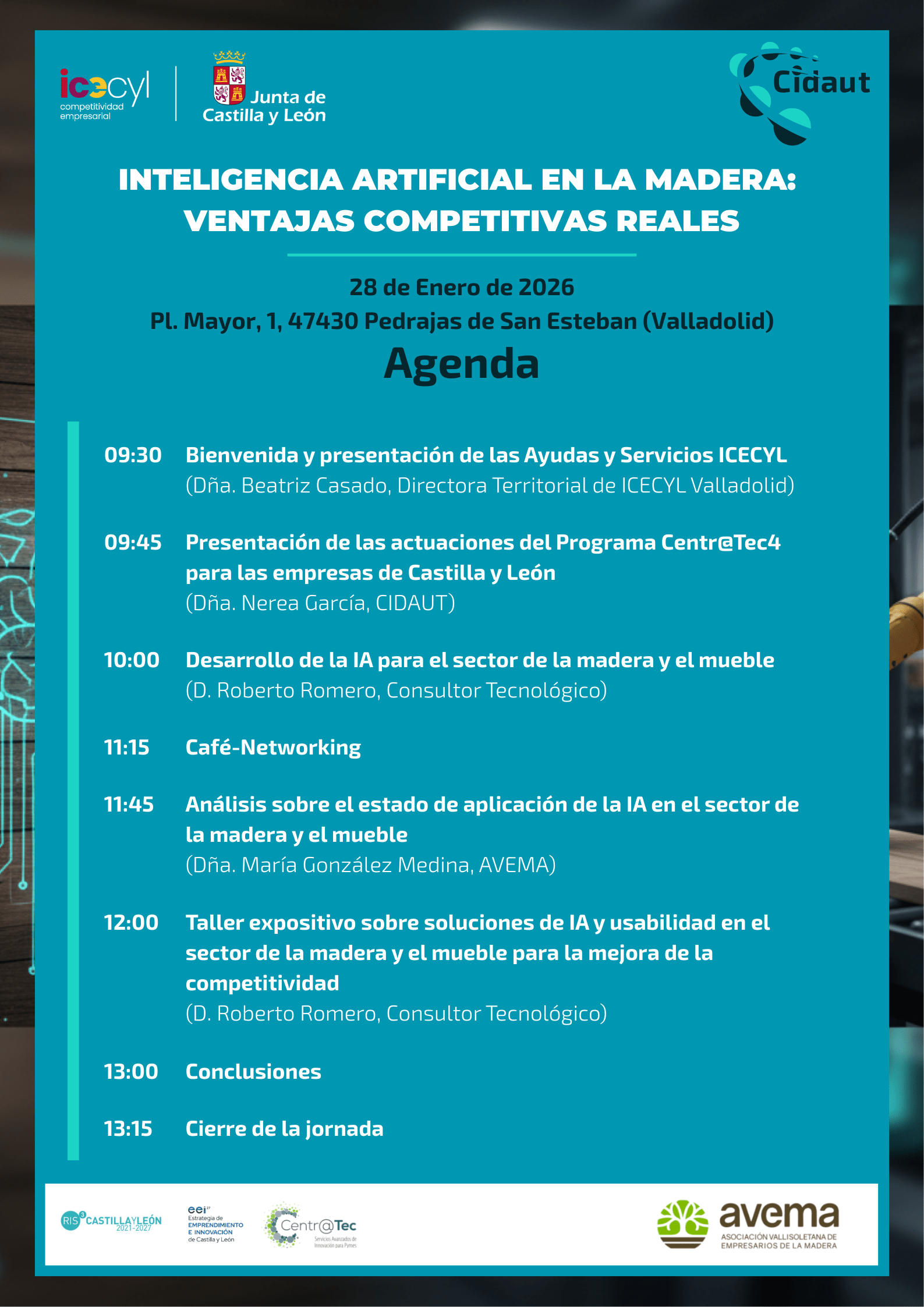 Esta jornada, organizada por Fundación Cidaut en colaboración con AVEMA y enmarcada dentro del programa Centr@tec4, está diseñada para empresarios y profesionales del sector, buscando demostrar con casos prácticos cómo la IA puede generar un impacto inmediato y ventajas competitivas reales en sus operaciones.