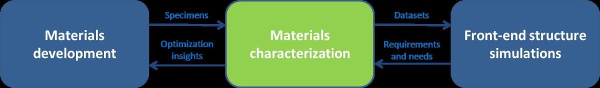 The development of safe, lightweight and circular vehicle structures that is at the core of SALIENT project relies heavily on the creation of advanced, tailored metallic and composite materials, as well as in the simulation of the performance of the components and structures that are made up of them. In both cases, materials characterization is a mandatory task. Regarding the former, materials characterization allows evaluating the performance of the developed materials under controlled load scenarios, thus generating valuable knowledge about their behavior and failure mechanisms. Concerning the latter, the datasets generated during coupon testing activities feed the material cards that are employed in the FEM software (LS-DYNA). So in SALIENT, materials characterization is considered the link between the physical and virtual dimensions of the front-end structure design process. By taking into account the interrelations that exist between all these activities, it is possible to develop the materials that are most suitable for a certain FES component.